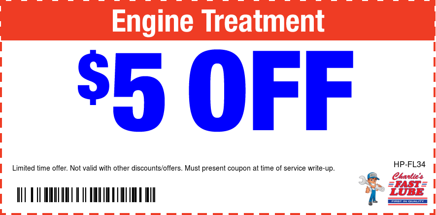 Good only atCharlie's Fast Lube Poplar Bluff Print coupon Offer details Engine Treatment $5 OFF * See coupon for exclusions. Email Coupon First name * Last name * Email address * Sign me up to receive future text offers from Charlie's Fast Lube Poplar Bluff: Via Text Cell/Mobile Phone By clicking "I accept" below, I expressly agree to receive marketing text messages made by or on behalf of Charlie's Fast Lube Poplar Bluff to the telephone number(s) I’ve listed above. I understand that I may receive such text messages by the use of Automatic Telephone Dialing Systems (including “Predictive Dialers” or “Autodialers”) and I agree to receive them even if I have registered my number(s) with my state or federal Do-Not-Call list(s). I understand that such text messages will include advertising containing offers for goods or services and that I may revoke this consent at any time by telephone, return text message or by Visiting charliesfastlubepoplarbluff.com/stop to unsubscribe. Message and data rates may apply. I also understand that I am NOT required to provide this consent as a condition of purchasing goods or services. I accept View: Text Specials Terms and Conditions with this link.
