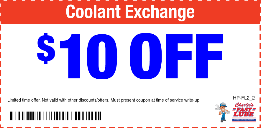 Good only atCharlie's Fast Lube Poplar Bluff Print coupon Offer details Coolant Exchange $10 OFF * See coupon for exclusions. Email Coupon First name * Last name * Email address * Sign me up to receive future text offers from Charlie's Fast Lube Poplar Bluff: Via Text Cell/Mobile Phone By clicking "I accept" below, I expressly agree to receive marketing text messages made by or on behalf of Charlie's Fast Lube Poplar Bluff to the telephone number(s) I’ve listed above. I understand that I may receive such text messages by the use of Automatic Telephone Dialing Systems (including “Predictive Dialers” or “Autodialers”) and I agree to receive them even if I have registered my number(s) with my state or federal Do-Not-Call list(s). I understand that such text messages will include advertising containing offers for goods or services and that I may revoke this consent at any time by telephone, return text message or by Visiting charliesfastlubepoplarbluff.com/stop to unsubscribe. Message and data rates may apply. I also understand that I am NOT required to provide this consent as a condition of purchasing goods or services. I accept View: Text Specials Terms and Conditions with this link.