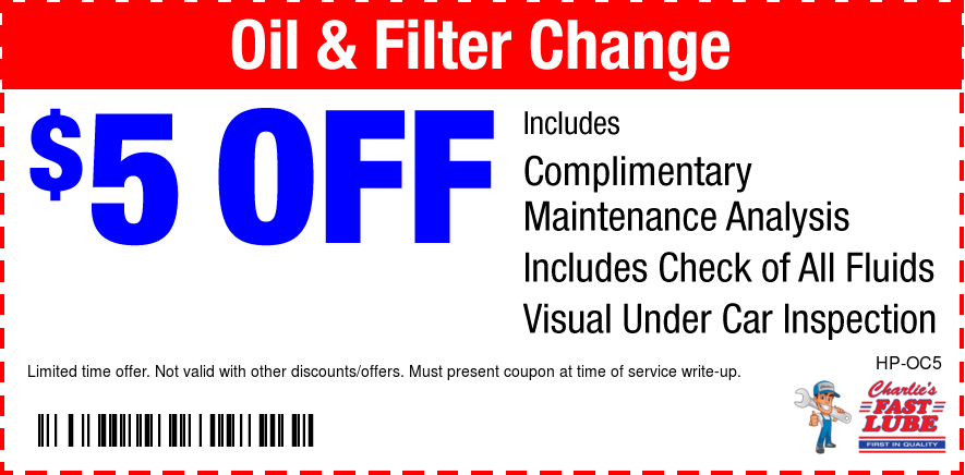 Good only atCharlie's Fast Lube Poplar Bluff Print coupon Offer details Oil Change & Filter $5 OFF * See coupon for exclusions. Email Coupon First name * Last name * Email address * Sign me up to receive future text offers from Charlie's Fast Lube Poplar Bluff: Via Text Cell/Mobile Phone By clicking "I accept" below, I expressly agree to receive marketing text messages made by or on behalf of Charlie's Fast Lube Poplar Bluff to the telephone number(s) I’ve listed above. I understand that I may receive such text messages by the use of Automatic Telephone Dialing Systems (including “Predictive Dialers” or “Autodialers”) and I agree to receive them even if I have registered my number(s) with my state or federal Do-Not-Call list(s). I understand that such text messages will include advertising containing offers for goods or services and that I may revoke this consent at any time by telephone, return text message or by Visiting charliesfastlubepoplarbluff.com/stop to unsubscribe. Message and data rates may apply. I also understand that I am NOT required to provide this consent as a condition of purchasing goods or services. I accept View: Text Specials Terms and Conditions with this link.